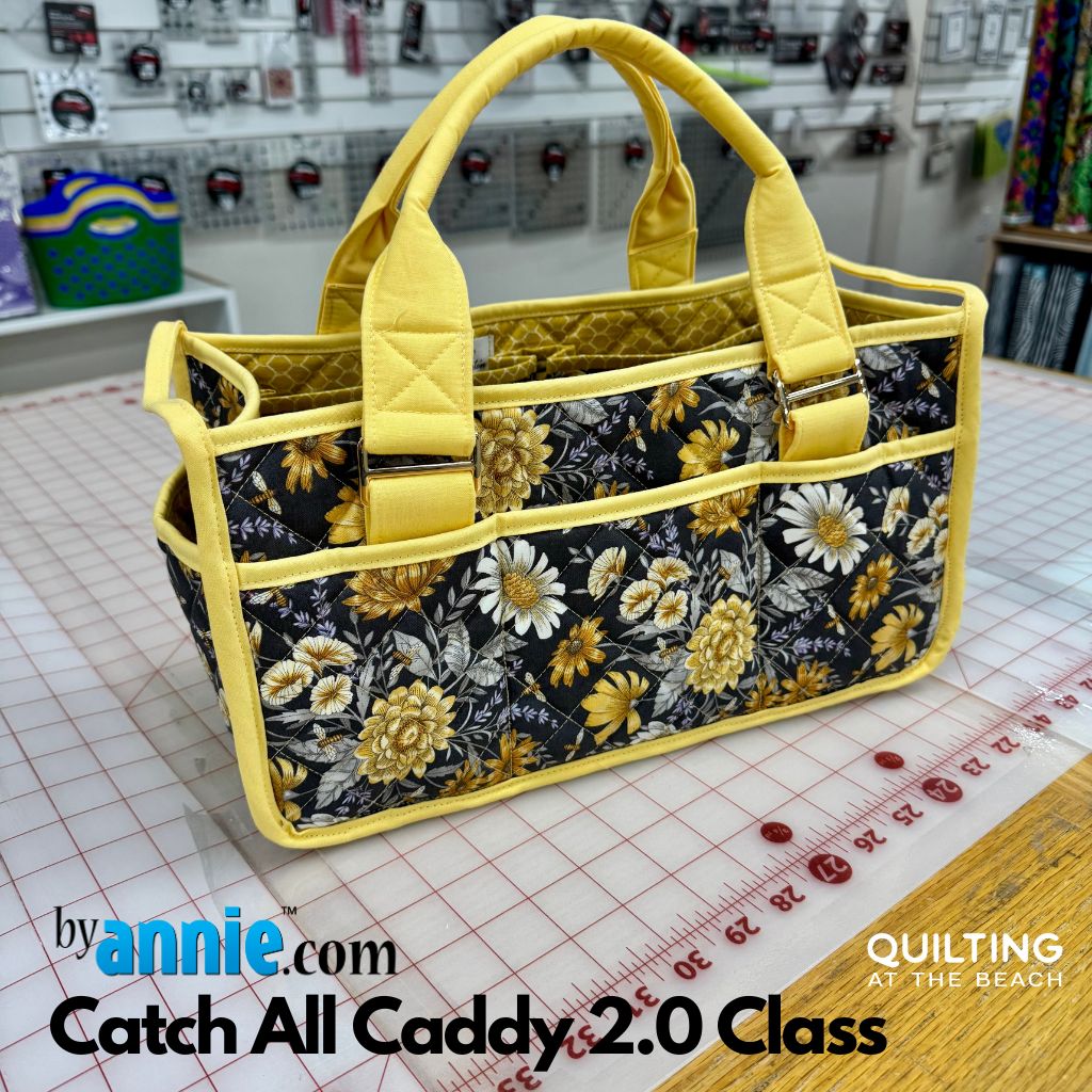Join Sheila for this amazing byAnnie tote. The By Annie Catch All Caddy 2.0 is a sturdy, oversized sewing pattern for a versatile organizer, featuring exterior slip pockets, an end zippered pocket, and expanding interior dividers that offer flexible storage for crafting, baby essentials, or car organization. Made with quilted fabric and padded handles that lie flat, this functional caddy measures about 7″ × 13.5″ × 6.5″ and teaches techniques like quilting with Soft and Stable, creating bellows, and binding.