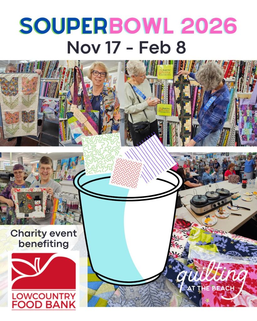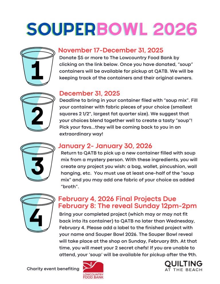 We are so excited to announce our Souper Bowl Quilt Soup Exchange for 2025/2026! This was a huge hit last year and together we raised over $500 for The Lowcountry Food Bank. That is equivalent to 3,240 meals for those in need!